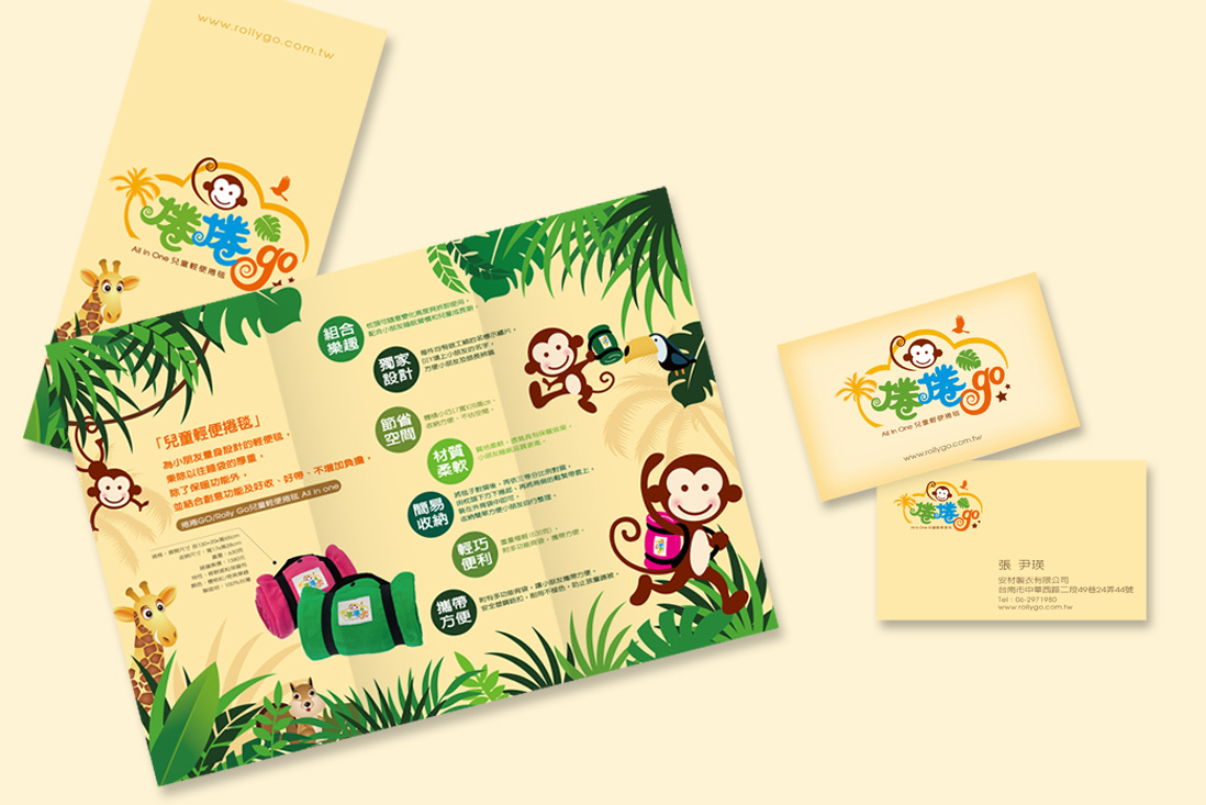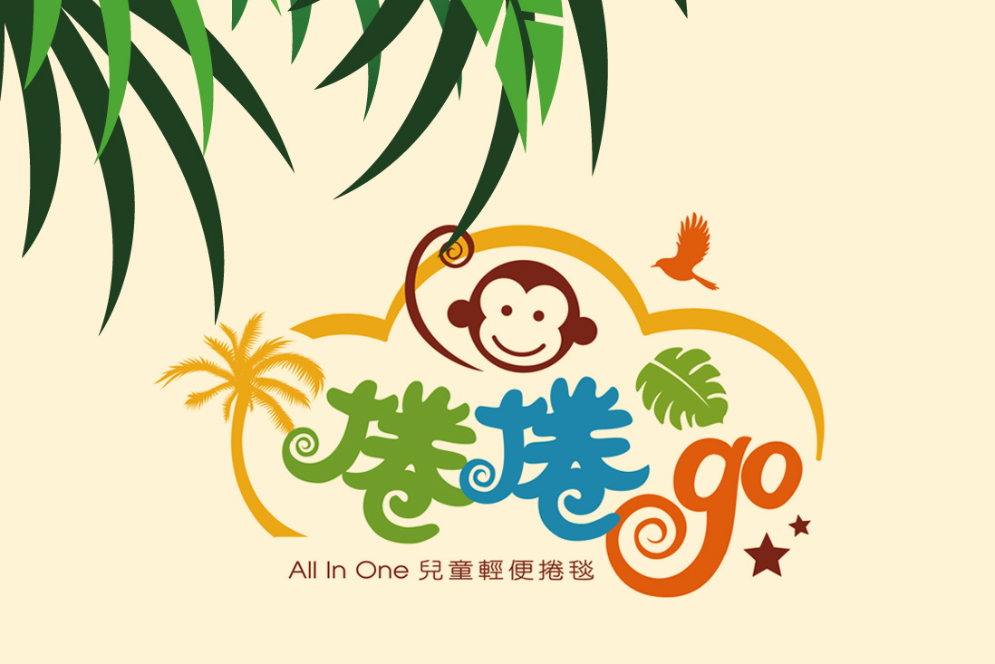 「捲捲Go」的品牌視覺設計主視覺冒險叢林元素與俏皮的猴子角色,搭配明亮飽和的色彩(如綠、橘、藍),營造出熱帶探險的氛圍,呼應品牌訴求的「All In One 兒童輕便捲毯」概念。Logo 中的「捲捲」字體以手寫感的筆觸呈現,增添童趣與親和力,而「go」的螺旋造型則巧妙呼應產品可捲式設計,具象化產品功能。