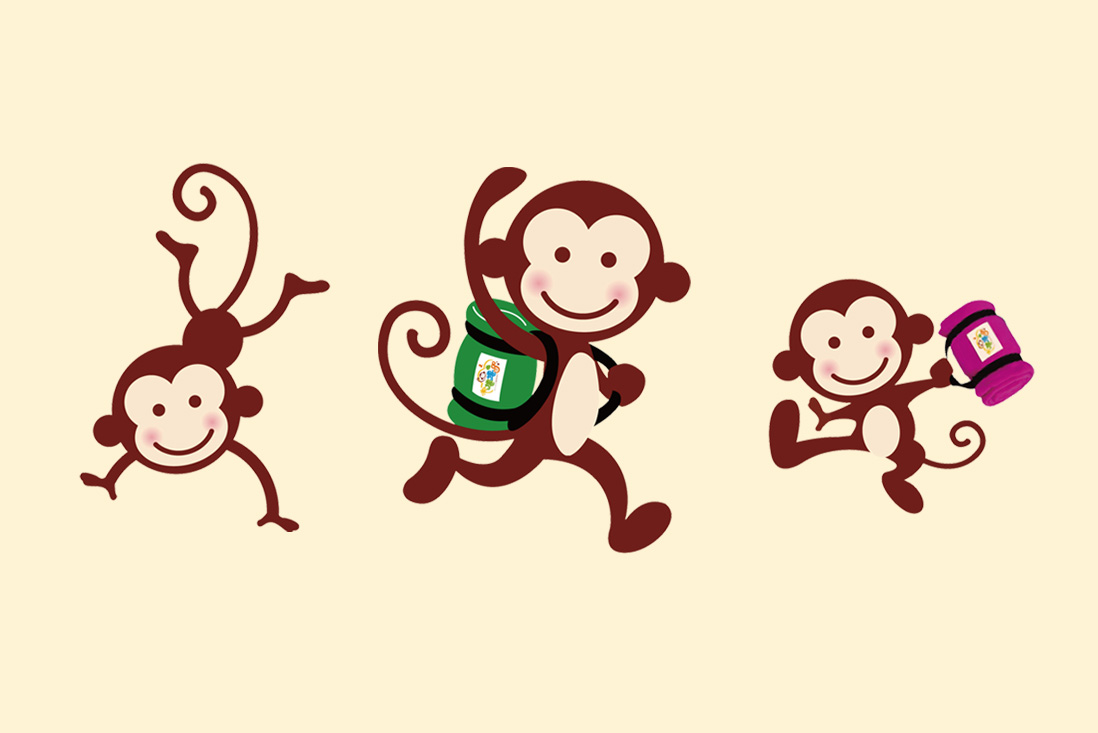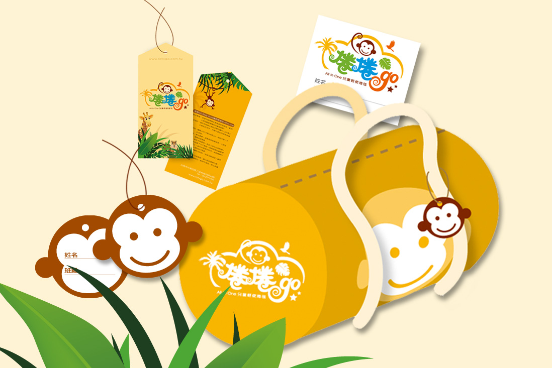 品牌角色「猴子」設計簡潔有力,表情友善、姿態靈動,應用於各式物件如吊牌、名片、提袋等,強化品牌辨識度與記憶點。此設計不僅吸引兒童目光,也讓家長感受到產品的實用性與趣味性,是一套兼顧功能與視覺吸引力的兒童品牌識別設計。